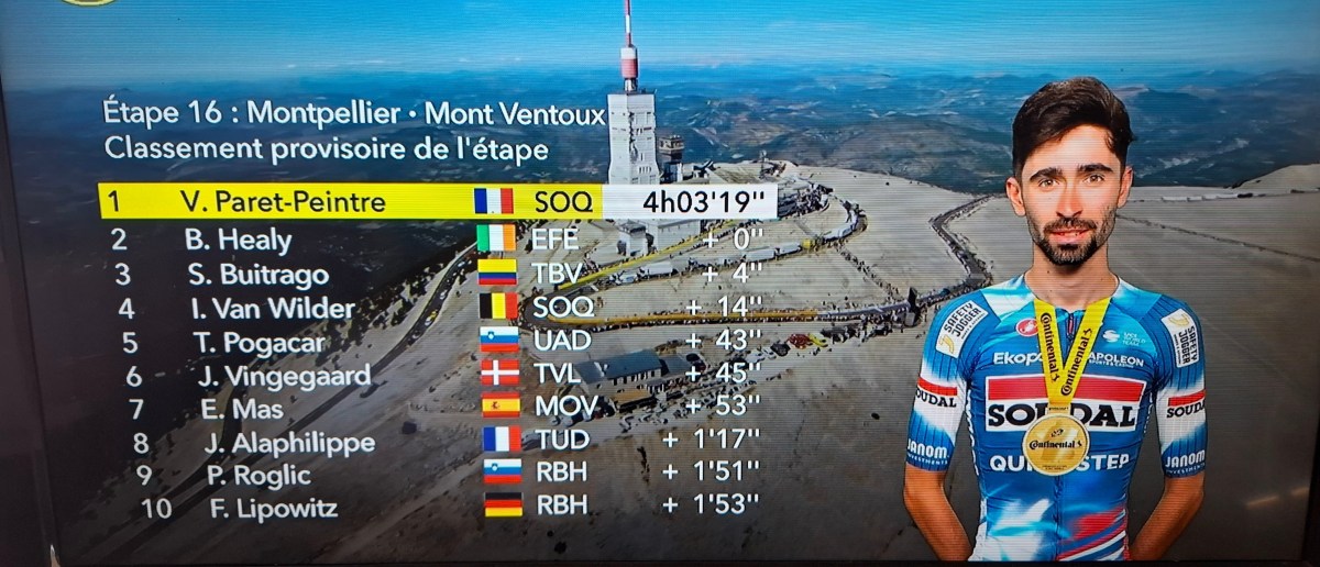PREMIERE VICTOIRE FRANCAISE AU SOMMET DU MONT VENTOUX VALENTIN PARET PEINTRE Enfin une victoire d’étape sur ce Tour de France 2025. Après un duel de haute lutte contre l’Irlandais Ben Healy, Valentin Paret-Peintre s’est imposé au sommet du Ventoux et décroche la plus belle victoire de sa carrière.