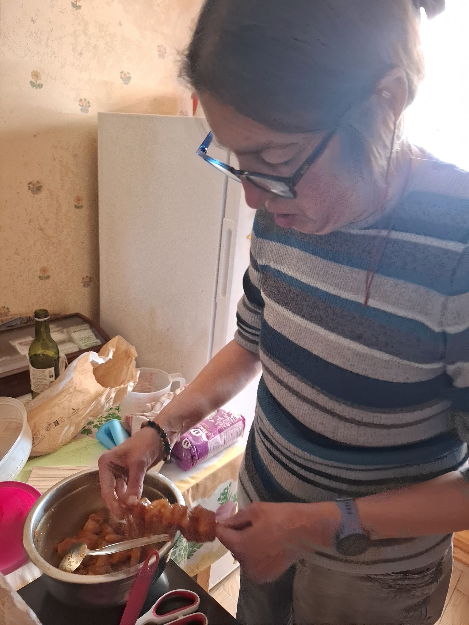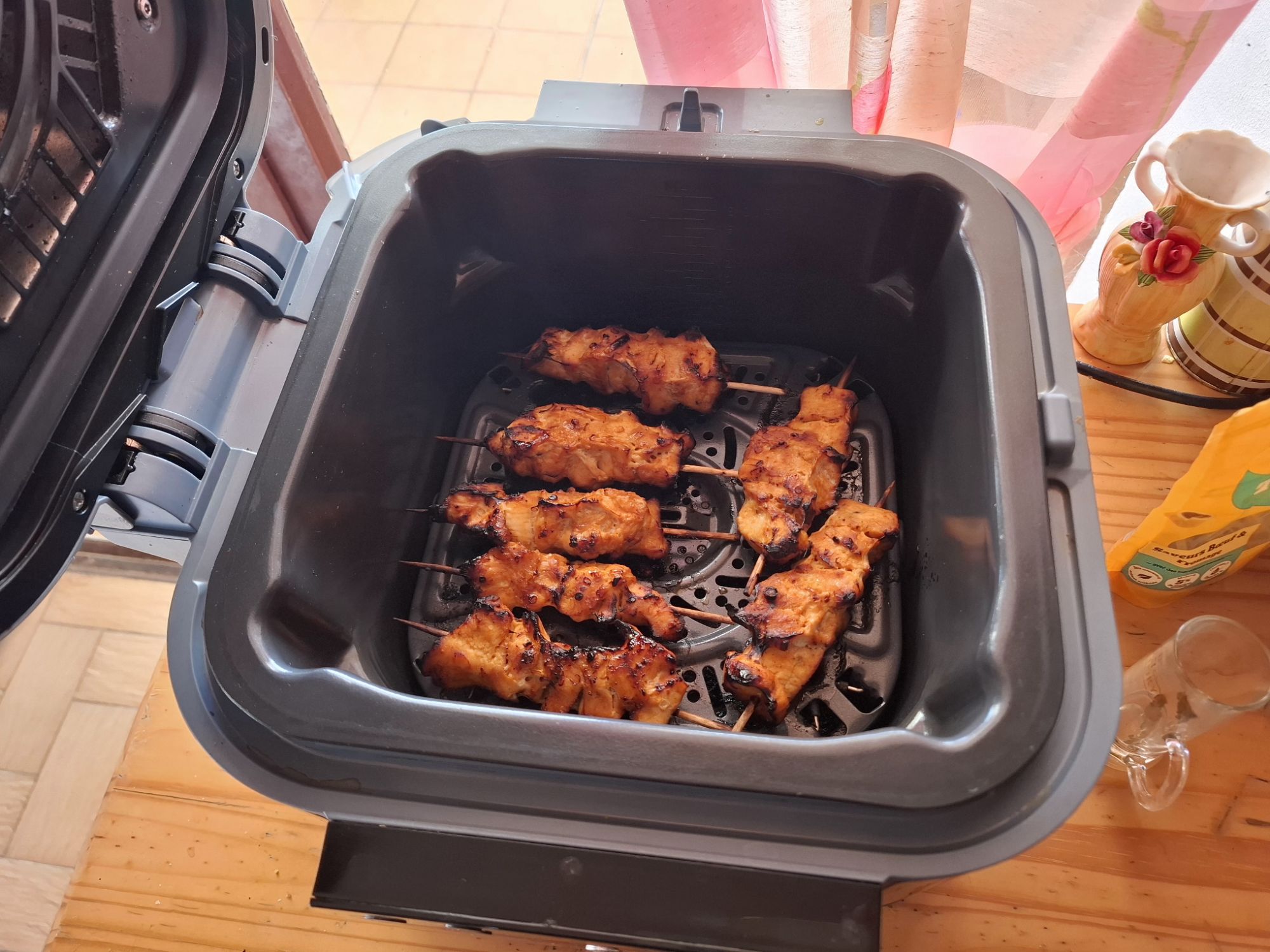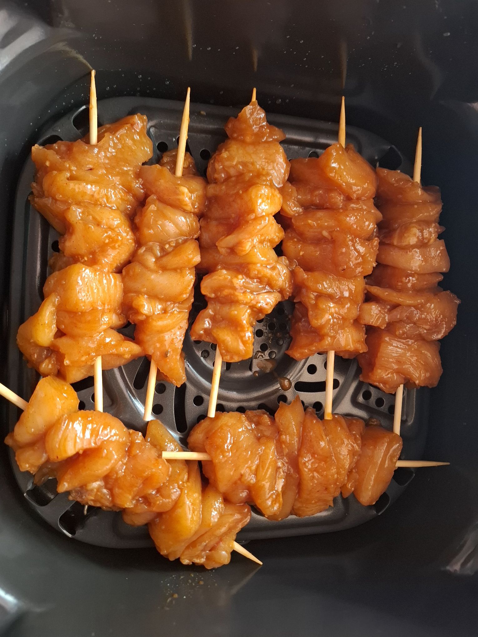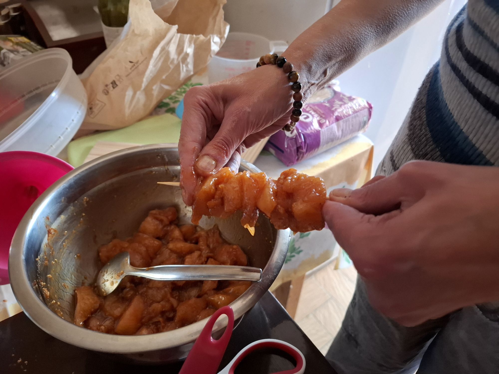 Sylvie et Thierry ont réinterprété cette tradition de leur propre façon. Savourez des brochettes de poulet (filets de poulet) savoureuses préparées avec de la marinade, de la sauce soja, des épices, du miel et de l’huile d’olive.