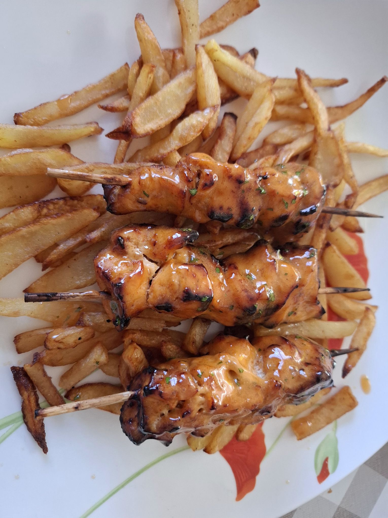 Avant de servir sur des pommes de terre ou frites, veuillez napper les brochettes avec la sauce (beurre fondu, miel, sauce aigre douce et persil).
